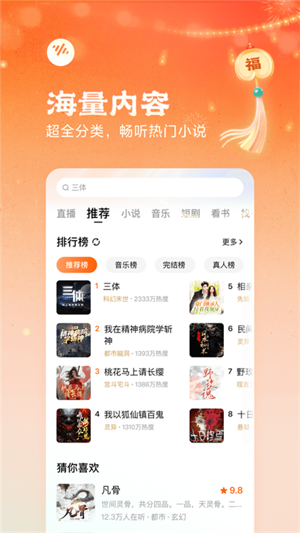 【正版畅听】海量小说,全场畅听!都市爽文、悬疑惊悚、言情穿越、玄幻修仙、 武侠江湖......超全分类,你想听的全都有!