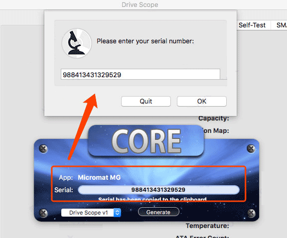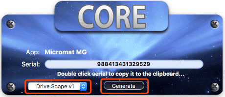 3、打开补丁软件“core Keygen”,先在左下角找到“DriveScope v1”,然后点击“generate”就会出现注册码。