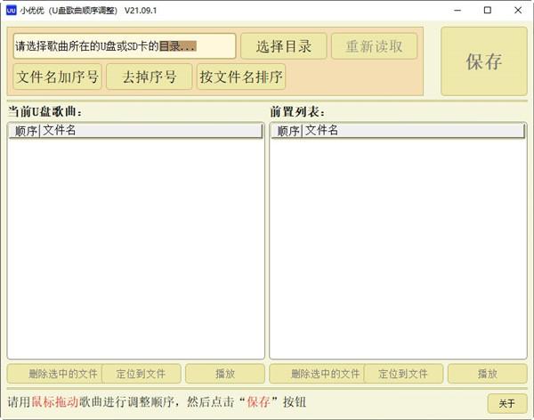 文件格式:软件主要支持MP3等常见的音频文件格式。如果存储设备中包含其他格式的文件,软件可能无法正确识别或调整其顺序。