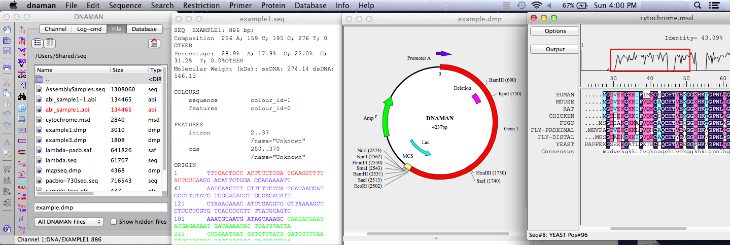 dnaman mac版是一款高度集成化的分子生物学应用软件,具有多功能功能的集成系统,以处理研究中常用的分析,使用它,你不仅可以从DNA序列的一条或两条链中搜索核苷酸序列,还可以完成所有日常核酸和蛋白质序列分析工作,其中包括多重序列比对、PCR引物设计、限制性酶切分析、蛋白质分析、质粒绘图等,非常适用于生物学研究领域进行使用。同时,其速度、多功能性、准确性和高质量的呈现,使该软件成为每个分子生物学家都可以依赖的基本工具之一,提供了20个序列通道以将活动序列保留在内存中,简化了多种功能分析,并大大提高了工作效率。