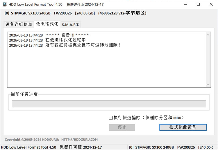 HDD Low Level Format Tool是一款功能实用、操作简单的硬盘低级格式化工具,在电脑硬盘维护、数据安全处理等场景中有着重要的使用价值。在日常使用电脑的过程中,硬盘容易出现数据残留、逻辑故障等问题,普通的格式化方式无法彻底清理,而这款工具能够从底层完成硬盘的格式化处理,满足用户彻底清除数据、修复硬盘基础故障的需求。软件的界面设计简洁清晰,操作流程直观易懂,不需要用户具备专业的电脑技术知识,就能按照步骤完成相关操作。它兼容市面上主流品牌的硬盘设备,覆盖多款经典与新款硬盘产品。