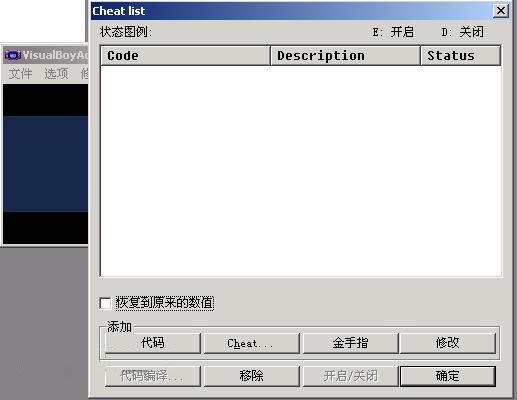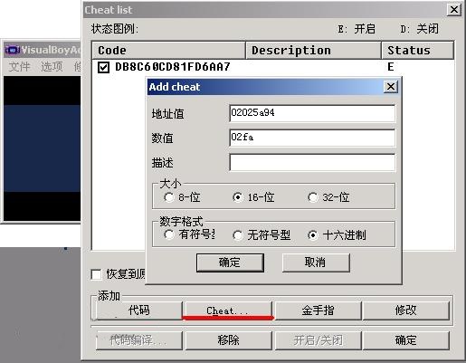 4、第二个按钮“Cheat..” 点击它后,会弹出一个小窗口(如图)。 在“地址值”栏中输入代码的格式必须是“xxxxxxxx”(8个数字/字母)。在“数值”一栏中输入代码的格是“xxxx”、"xx"。“描述”一栏可写可不写。细心的朋友肯定发现了,在“地址值”中输入的代码,其实就是上面说的格式“xxxxxxxx:xxxx”,冒号左边的代码,而在“数值”栏中输入的,正好是冒号右边的代码。之后在“大小”栏中选择“16-位”,在“数字格式”中选择“十六进制”,点击“确定”就可以了。
