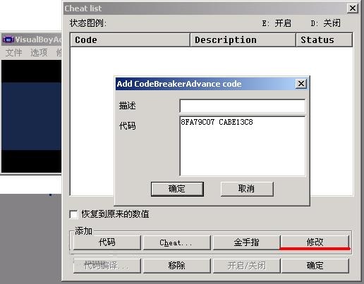 6、最后一个按钮“修改” 点击它后,便会弹出这个窗口。“描述”可写可不写。在“代码”栏中输入金手指的格式是“xxxxxxxx xxxxxxxx”,也就是8个数字/字母+空格+8个数字/字母。注意别漏了中间的空格。输入完毕后点击“确定”即可。 说到这里,如何输入金手指就已经说完了。如果大家还是不知道哪种金手指要往哪输入的话,就请把要输入的金手指往每个按钮都试一下,一定有一个可以输入的。因为有很多金手指不可能每一条都告诉大家该往哪输入,主要是让大家懂得一个方法。