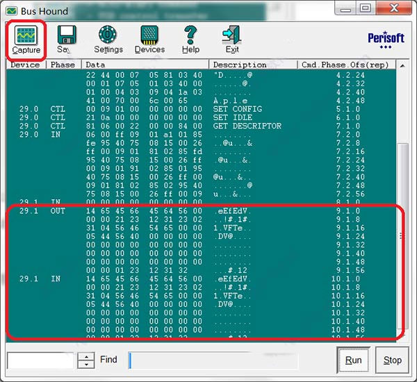 5、点击“Capture”菜单选项,观察USB上传的数据
