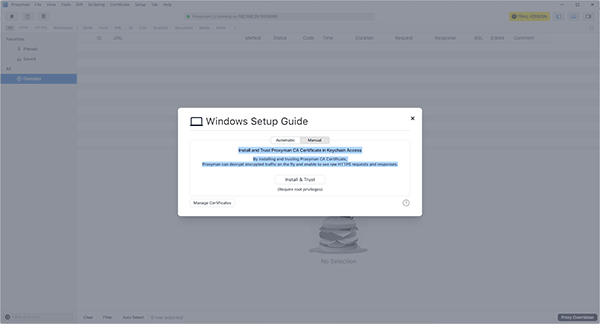 2、之所以需要通过安装并信任 Proxyman CA 证书,可以实时解密加密流量,并允许查看原始的 HTTPS 请求和响应,下图是自动安装证书方式,很容易安装失败