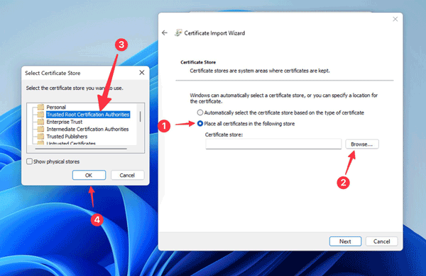 安装证书 -> 选择“当前用户” -> 选择“将所有证书放在以下存储中” -> “浏览...”